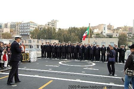 4 marzo 2009 - Il pattugliatore è stato accolto in porto al suono delle sirene delle navi, dal lancio di acqua dei rimorchiatori. Dopo l'ingresso nella rada Megarese, il pattugliatore ha ormeggiato al posto numero 10 della banchina "Tullio Marcon". Le operazioni di ormeggio sono state seguite dai familiari ospitati sul balcone della sede di Comforpatt. L'equipaggio, al comando del Capitano di Fregata Danilo Murciano,ricordiamo che è stato insignito della medaglia ONU per aver prestato servizio nell’ambito della missione UNIFIL nelle acque del Libano. Nave Comandante Foscari, che è inquadrata anche nella Forza Marittima Europea (EUROMARFOR), è entrata a far parte del dispositivo internazionale che opera sotto egida delle Nazioni Unite nell’Operazione Impartial Behaviour il 5 dicembre 2008. A dare il saluto all'equipaggio il Contrammiraglio Roberto Camerini comandante delle Forze da Pattugliamento per la Sorveglianza e la Difesa Costiera(vedi immagine a sinistra). "Un ringraziamento va al comandante dell'unità e agli uomini che in questi mesi hanno portato a termine una impegnativa missione internazionale con grande professionalità e attaccamento alla nazione. Ho appreso con grande commozione che l'equipaggio ha ricevuto la medaglia delle Nazioni Unite. Unringraziamento va anche alle famiglie dei componenti dell'equipaggio per la pazienza dimostrata in questi 100 giorni che ha tenuti lontano i loro affetti". La cerimonia a cui ha accennato l'ammiraglio Camerini si è svolta, alcuni giorni prima, sul ponte di volo della nave, in pattugliamento nelle acque libanesi. Ad appuntare le medaglie sul petto dei marinai è stato il Comandante di “Unifil Sector West”, Generale di Brigata Flaviano Godio, in rappresentanza del Comandante della Missione Unifil, Generale di Divisione Claudio Graziano(vedi immagine a destra).